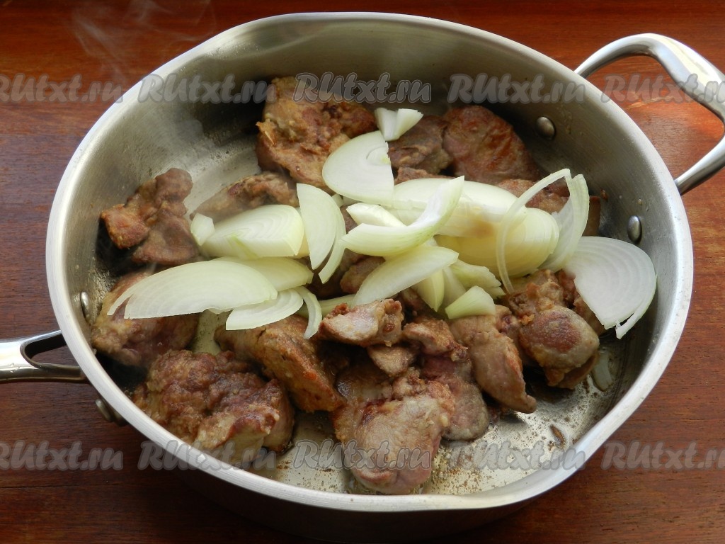 Очищенный лук нарезать на тонкие полукольца, добавить его в сковороду к печени, перемешать.