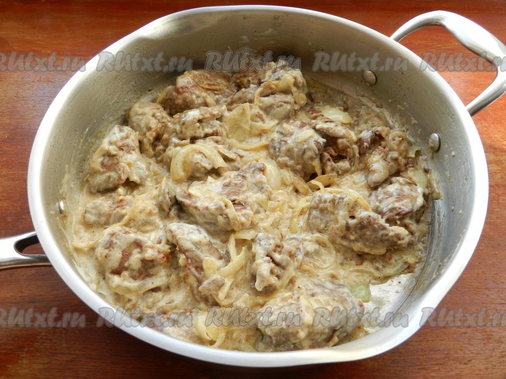 Затем к куриной печени, обжаренной с луком, добавить соль, чёрный молотый перец, по желанию, щепотку мускатного ореха, выложить сметану. Перемешать и готовить на медленном огне под крышкой в течение 7-8 минут (до готовности печени), периодически перемешивая.