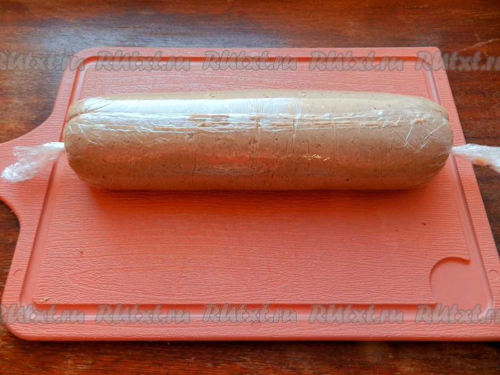 Аккуратно поднимая края плёнки, свернуть печёночный слой с начинкой в рулет. Завернуть плотно получившийся рулет в плёнку, закрутить и завязать концы плёнки. В таком виде убрать рулет из куриной печени с начинкой в холодильник на 2 часа или более.