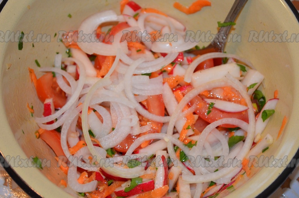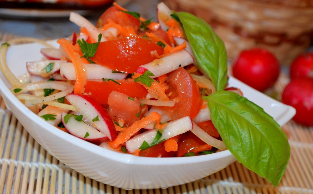 Овощной салат из морковки и редиса получается не только вкусным, но ещё и легким, полезным. Особенно он понравится тем, кто следит за своей фигурой.