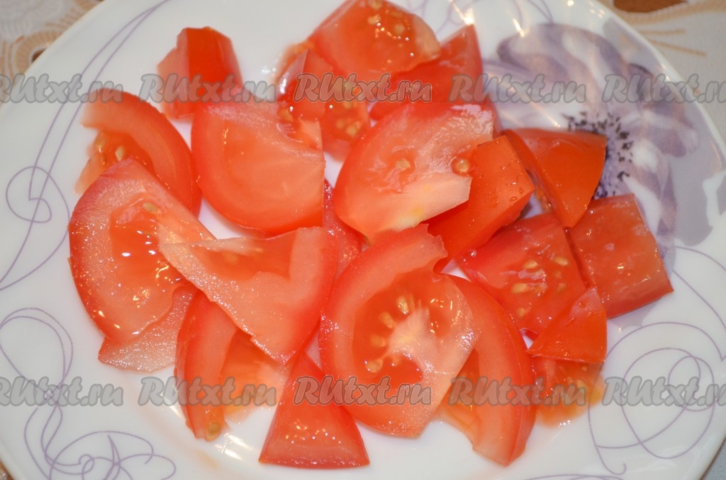 Выложить в миску редис, морковку, помидоры, зелень и чеснок. Добавить в салат порезанный полукольцами лук.