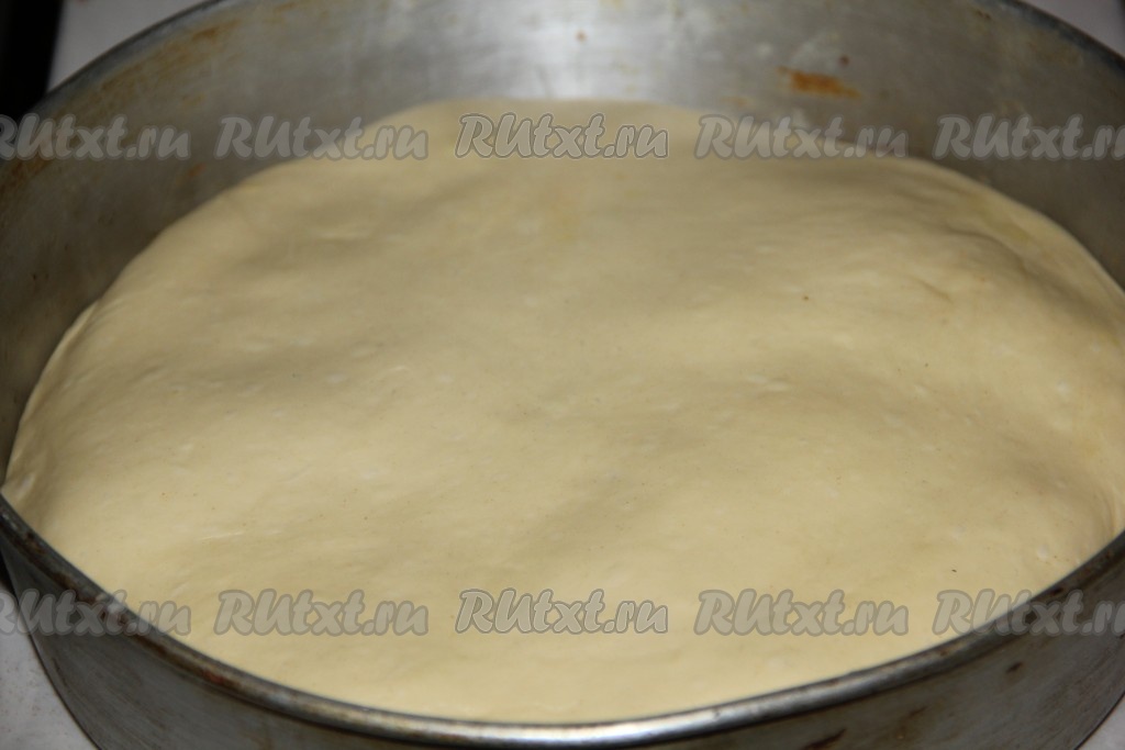 Для приготовления теста в кефир добавить яйца и взбить, следом добавить растительное масло, соль, сахар и соду. Муку просеять и добавить к кефиру. Замесить тесто, оставить отдохнуть его на 1 час. Отдохнувшее тесто раскатать и накрыть им наше мясо, образуя бортики, лишнее тесто обрезать.