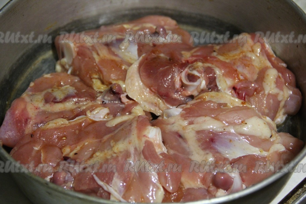 На дно формы, либо сковороды выложить одну порезанную полукольцами луковицу. На лук выложить кусочки курицы, лицевой частью ко дну формы.