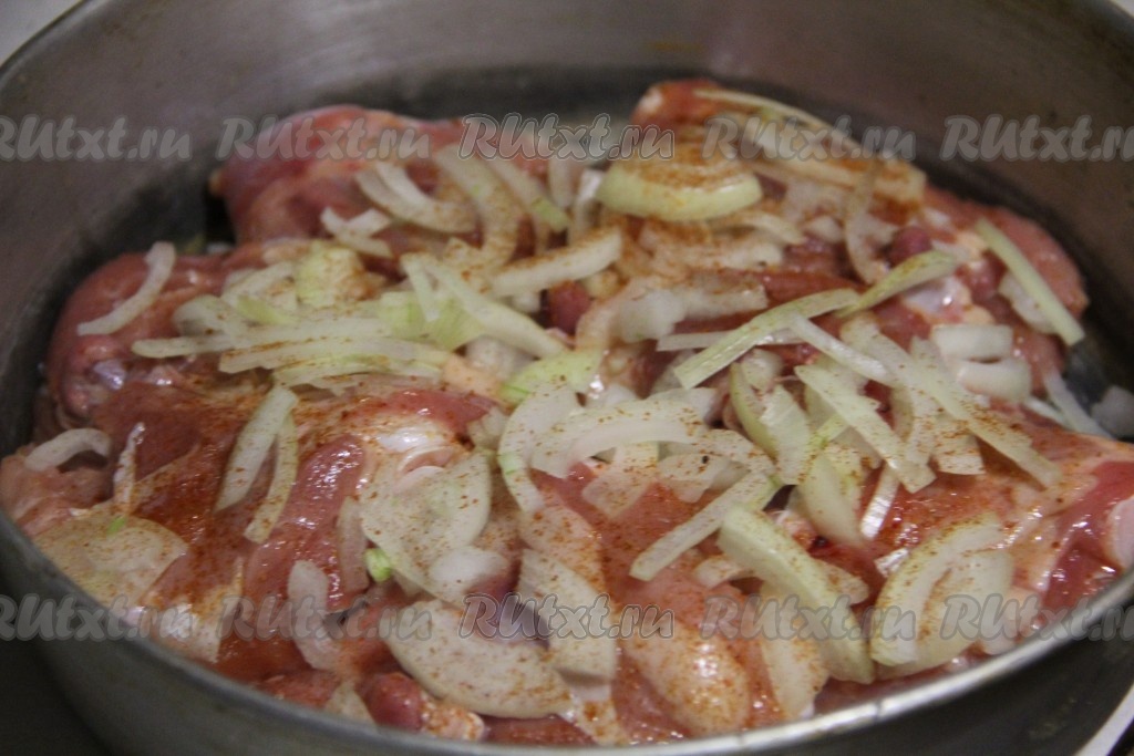 На мясо выложить вторую луковицу, посыпать его любимыми специями, а также солью.