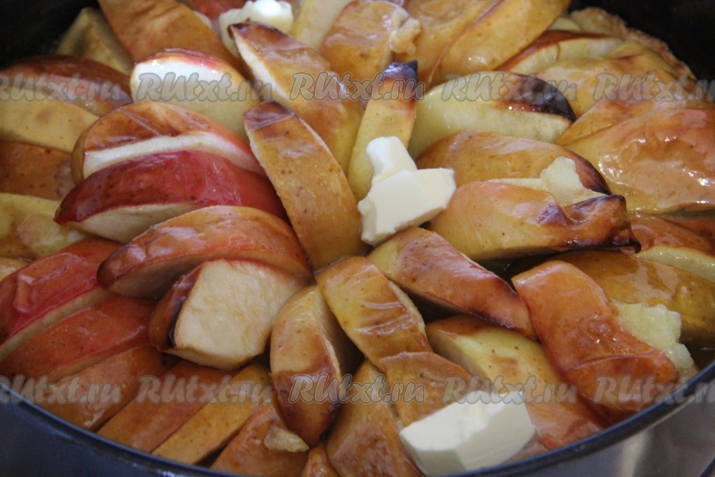 Поставить форму с яблочным пирогом в разогретую духовку, выпекать минут 40 при температуре 180 градусов. Достать горячий пирог, полить соком, оставшимся после тушения яблок, по желанию, выложить кусочки сливочного масла и присыпать слегка сахаром. Отправить в горячую духовку ещё на 5-10 минут.