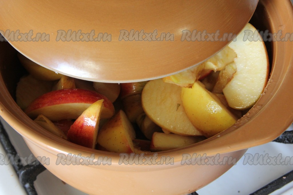 Яблоки нарезать на средние дольки, сбрызнуть лимонным соком и добавить в казанок с растопленными маслом и сахаром, перемешать. Тушить яблоки под крышкой на небольшом огне 7-15 минут (пока яблоки не станут мягкими, но при этом они должны хорошо держать форму), периодически аккуратно перемешивая. Затем мягкие яблочные дольки убрать с огня и дать им немного остыть.