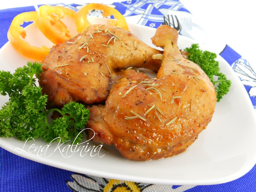 Необыкновенно вкусные, с пьянящим ароматом, нежнейшие кусочки курицы, запечённые в соевом соусе с мёдом и горчицей, выложить на тарелку, полить маринадом, в котором они запекались. Сверху немного посыпать розмарином. Подать к столу в тёплом виде с овощами и зеленью. Очень советую попробовать!
