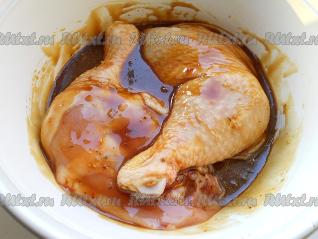 Кусочки курицы посыпать немного специями и поместить в подготовленный маринад из соевого соуса, мёда и горчицы, обмазать мясо со всех сторон и оставить мариноваться на 3-4 часа. За время маринования несколько раз кусочки курицы перевернуть.
