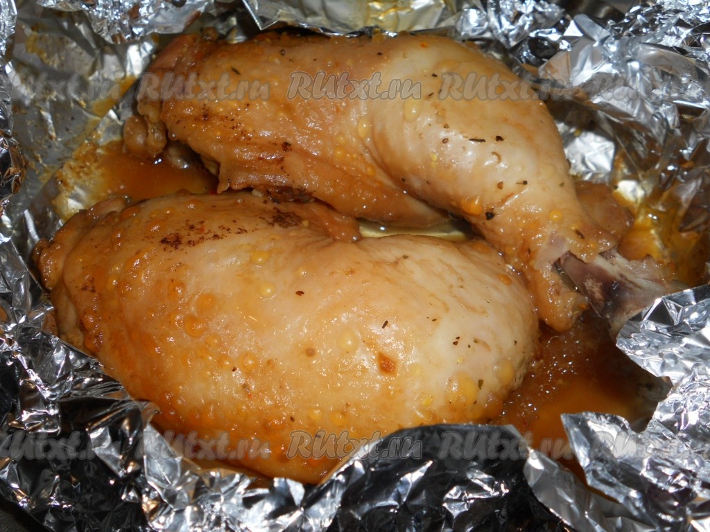 Фольгу хорошо завернуть с боков и сверху (мясо должно быть полностью в фольге). Запекать в предварительно разогретой до 200-220 градусов духовке 25-30 минут. Затем верх фольги развернуть и запекать ещё 15 минут (до готовности), чтобы курочка зарумянилась.