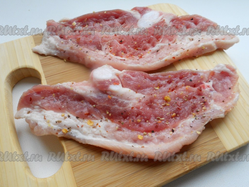 Каждый кусок грудинки отбить молоточком. Посолить, поперчить и посыпать специями. Оставить на 30 минут.