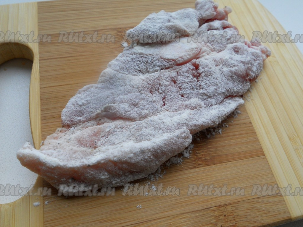 Разогреть сковороду с растительным маслом (буквально 1 столовую ложку). Обвалять куски мяса в муке.