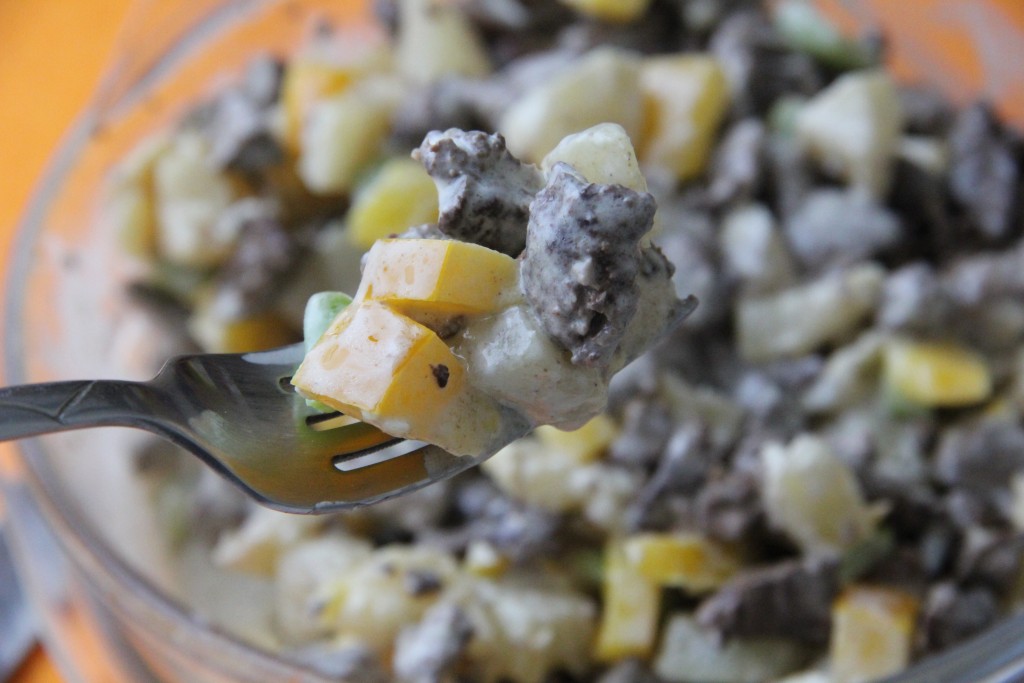 Заправить майонезом, перемешать и подавать к столу вкуснейший салат с печенью и ананасами.