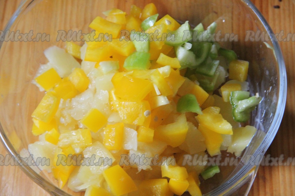 Куриную печень измельчить и обжарить на растительном масле до готовности. Добавить теплую печень в салат к ананасам и перцу.