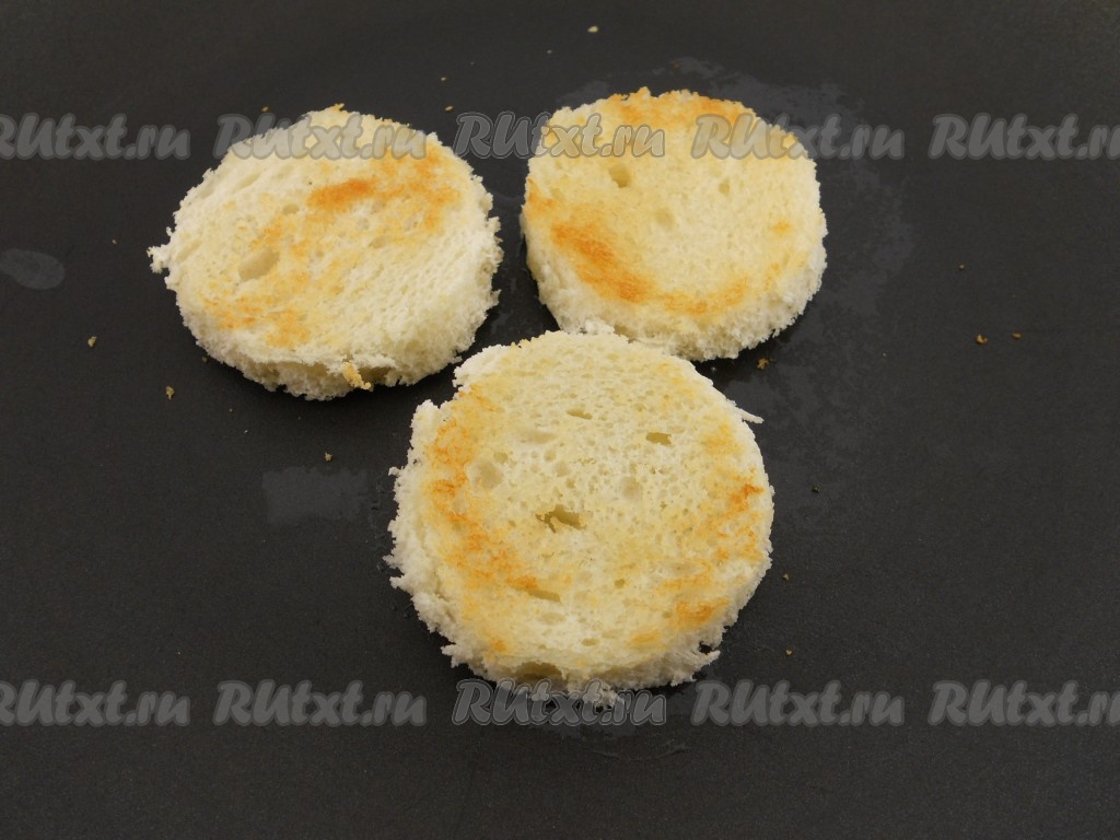 Подсушить и немного обжарить на сливочном масле одну сторону хлебных кружочков. Дать остыть.