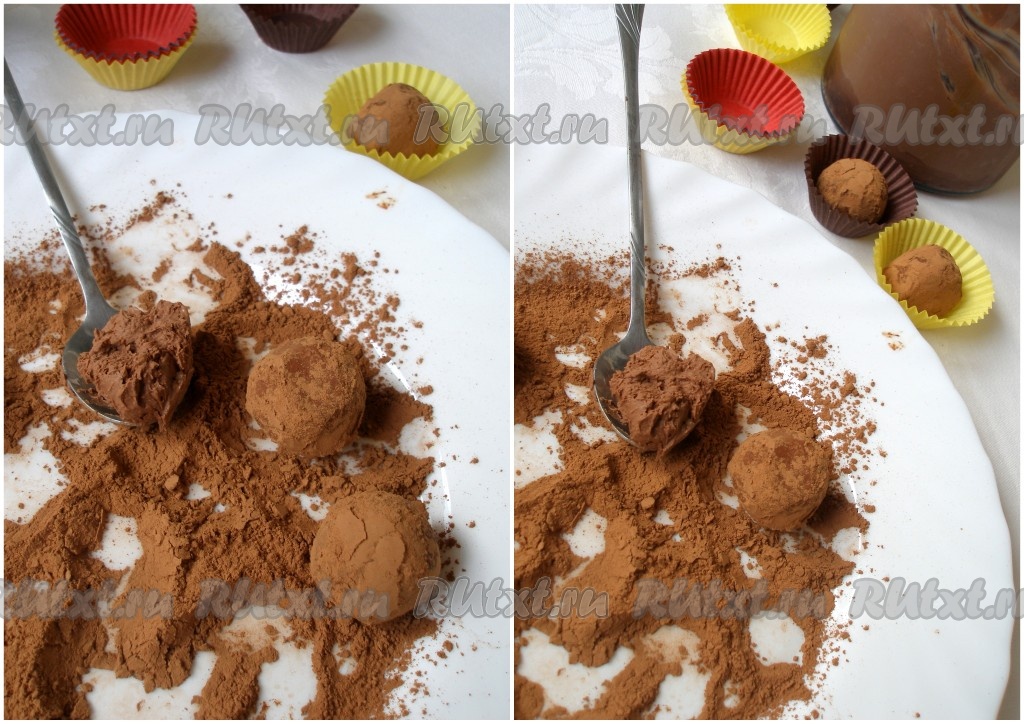 Насыпать в тарелку какао. Загустевшую массу набирать ложкой, затем скатывать руками небольшие шарики, обваливая их в какао со всех сторон. Раскладывать готовые трюфели по бумажным формочкам для конфет.