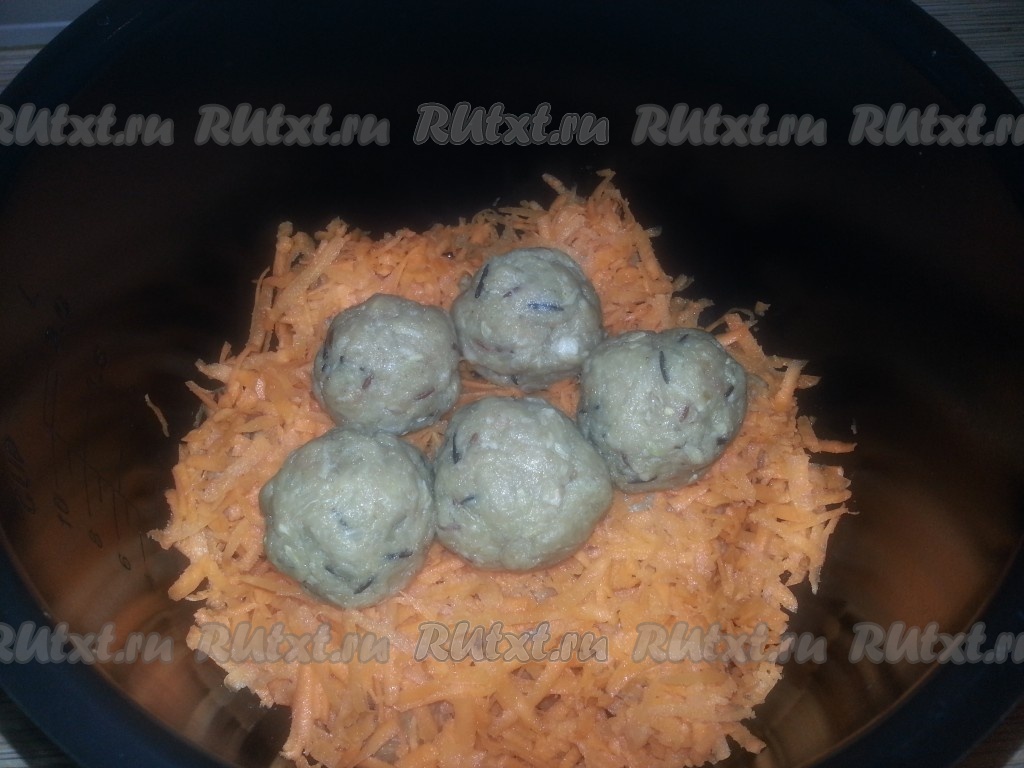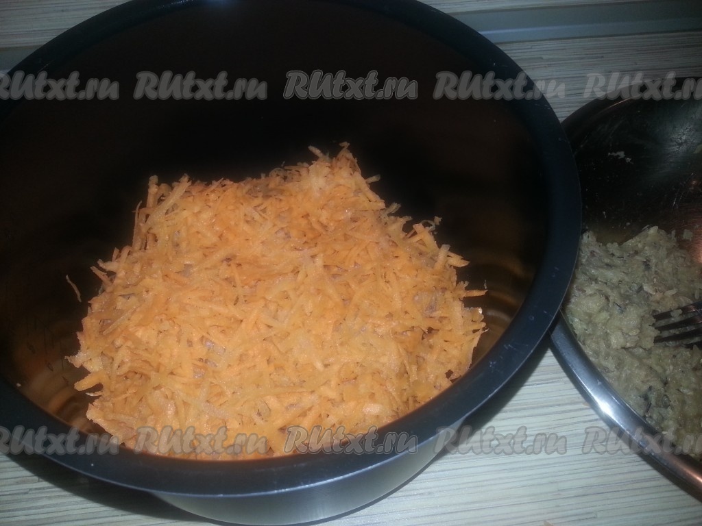 Уложить их в чашу мультиварки, пересыпая каждый слой тертой морковью (сверху должна быть морковь).