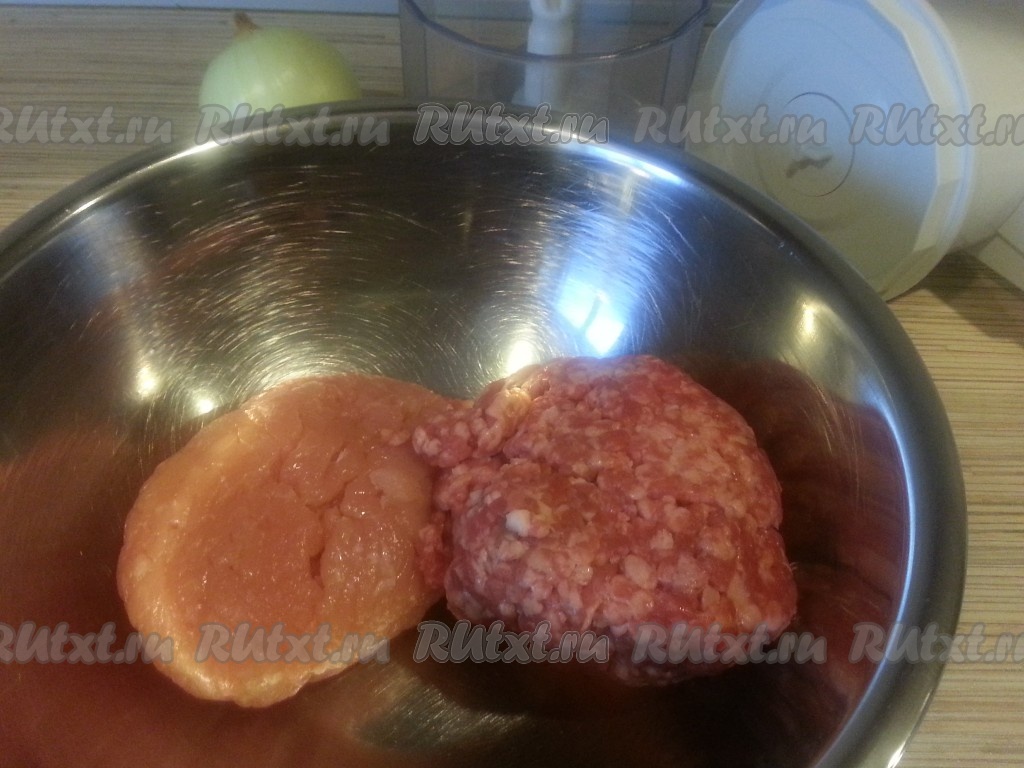 Через блендер пропустить фарш и лук. Перемешать и добавить пропущенный через пресс чеснок, соль, перец, мускатный орех, рис и яйцо. Тщательно все перемешать и сформировать шарики.