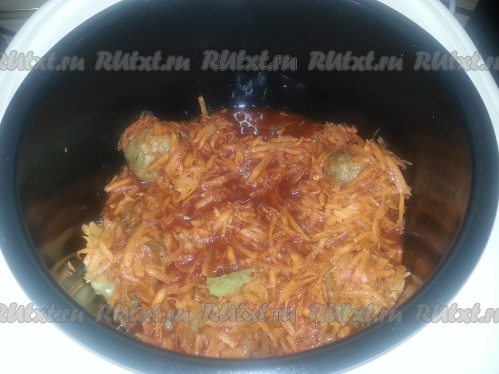 Положить лавровый лист сверху. В кружке смешать кипяток и томатную пасту, залить этой смесью ёжики из фарша. Посолить и готовить на режиме мультиварки «тушение».