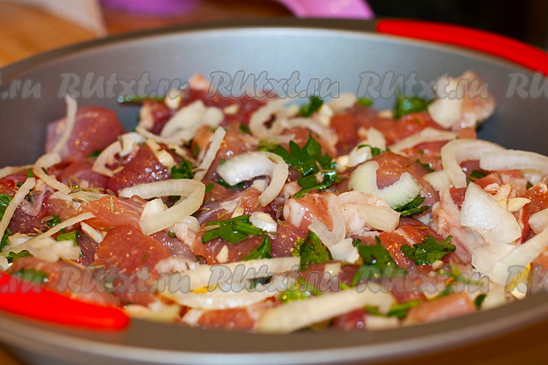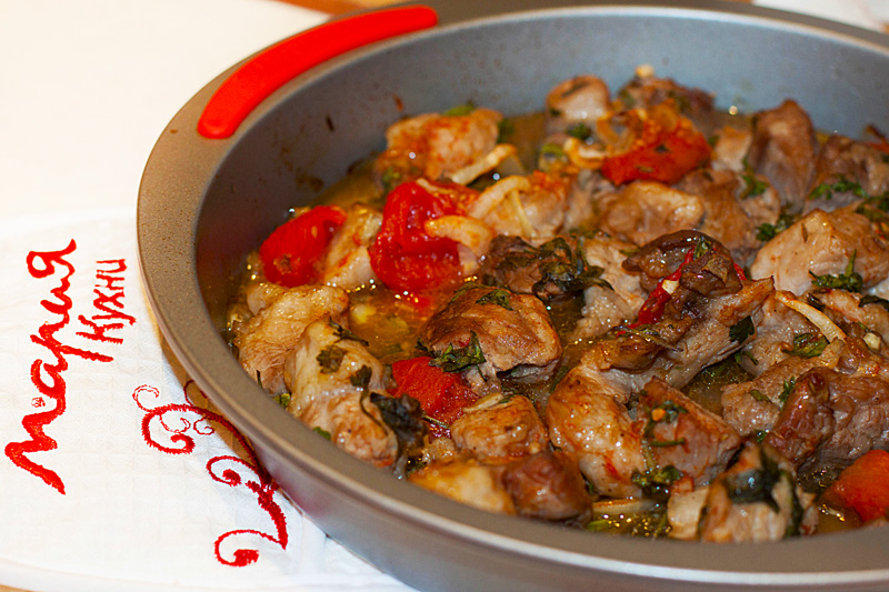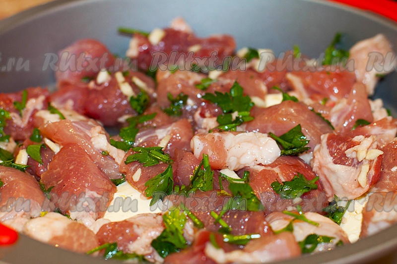 Нарежьте свинину небольшими кусочками, посолите, поперчите, добавьте зиру, рубленную зелень и чеснок. Полейте мясо гранатовым соусом. Выложите мясо в форму для запекания на кусочки сливочного масла.