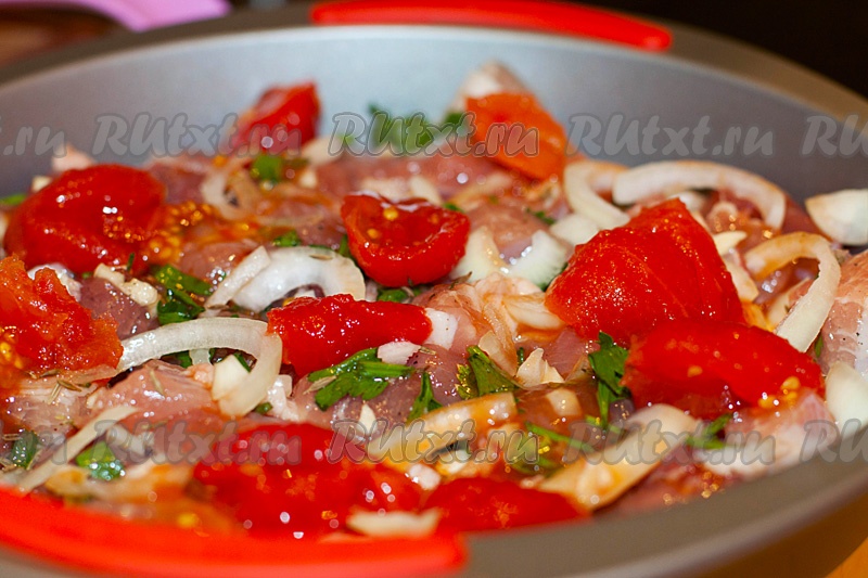 Консервированные томаты освободите от шкурки и разрежьте пополам. Выложите поверх мяса с луком и полейте несколькими ложками сока.