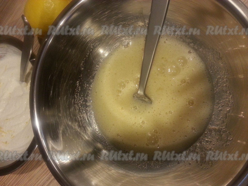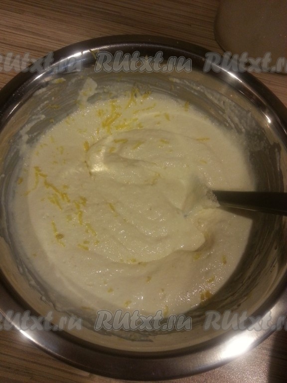 Тщательно перемешать. Натереть цедру на мелкой терке. Добавить разрыхлитель и цедру к массе.