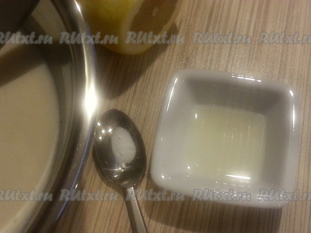 В блюдце выдавить сок лимона, погасить им соду, добавить к нашей массе.