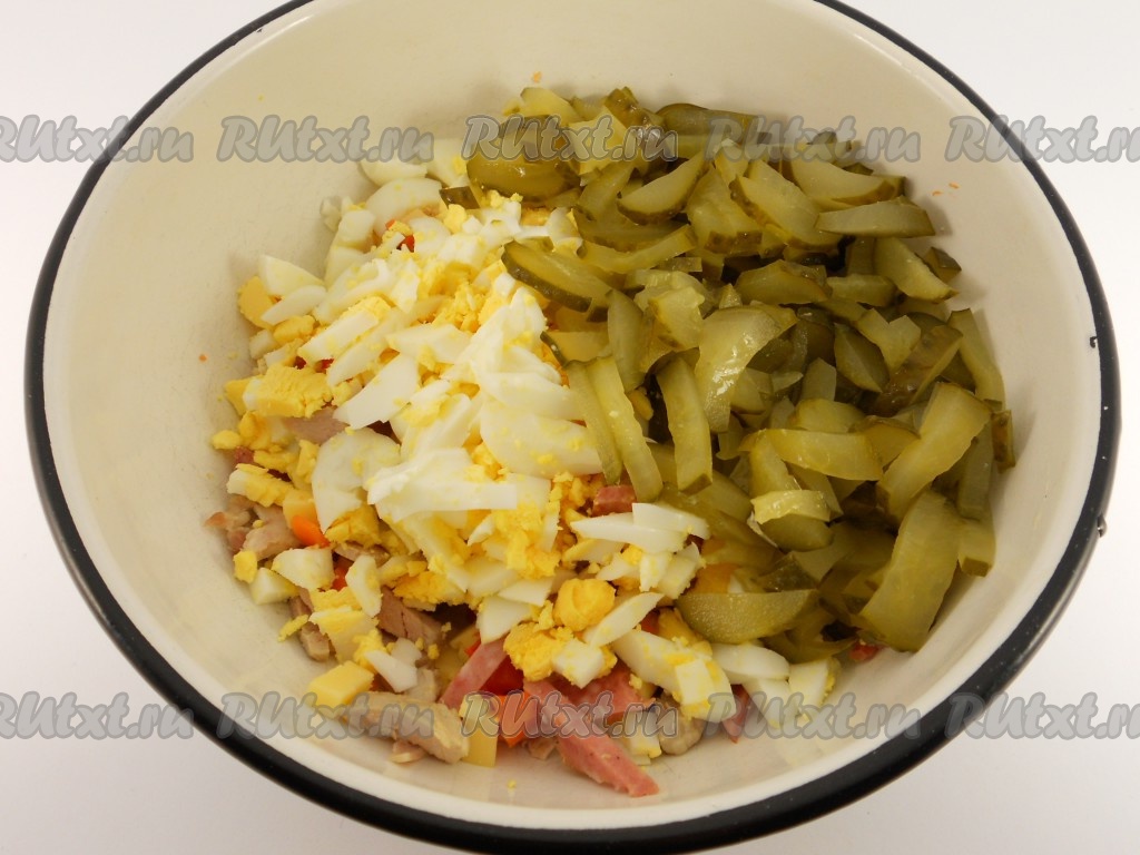 Огурцы маринованные нарезать соломкой, яйца измельчить и также добавить к остальным продуктам.