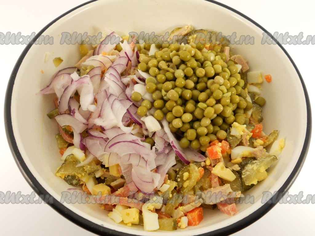 Добавить порезанный тонкими полукольцами крымский лук и консервированный горошек (воду слить).