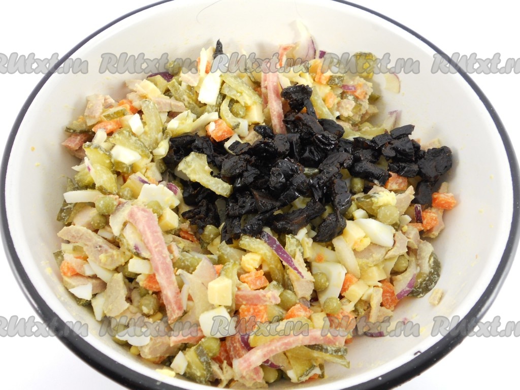 Чернослив предварительно замочить в горячей воде на 20-30 минут, обсушить и нарезать небольшими кусочками. Выложить в салат.