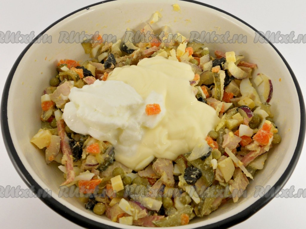 Перемешать, добавить измельчённый чеснок, посолить и поперчить, заправить йогуртом и майонезом.
