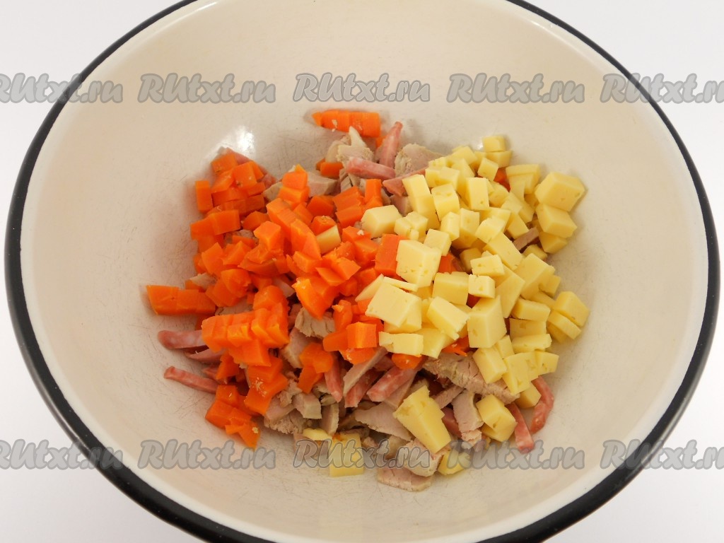 Морковь и твердый сыр порезать небольшими кубиками, добавить к мясу и колбасе.