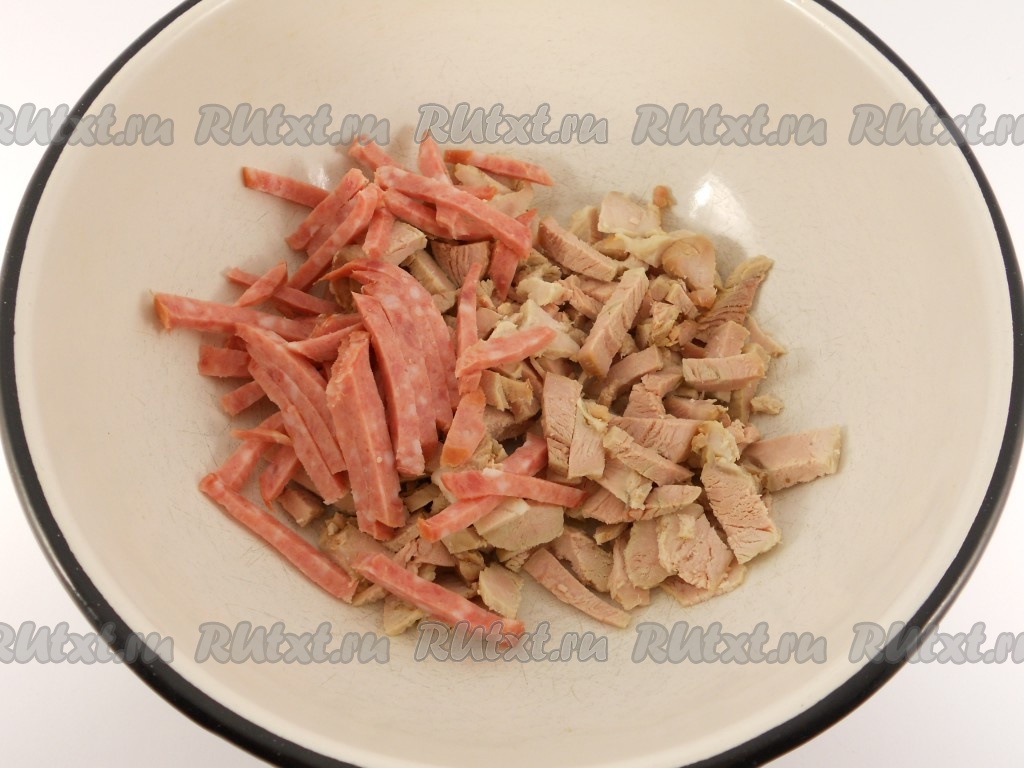 Свинину и колбасу порезать соломкой.