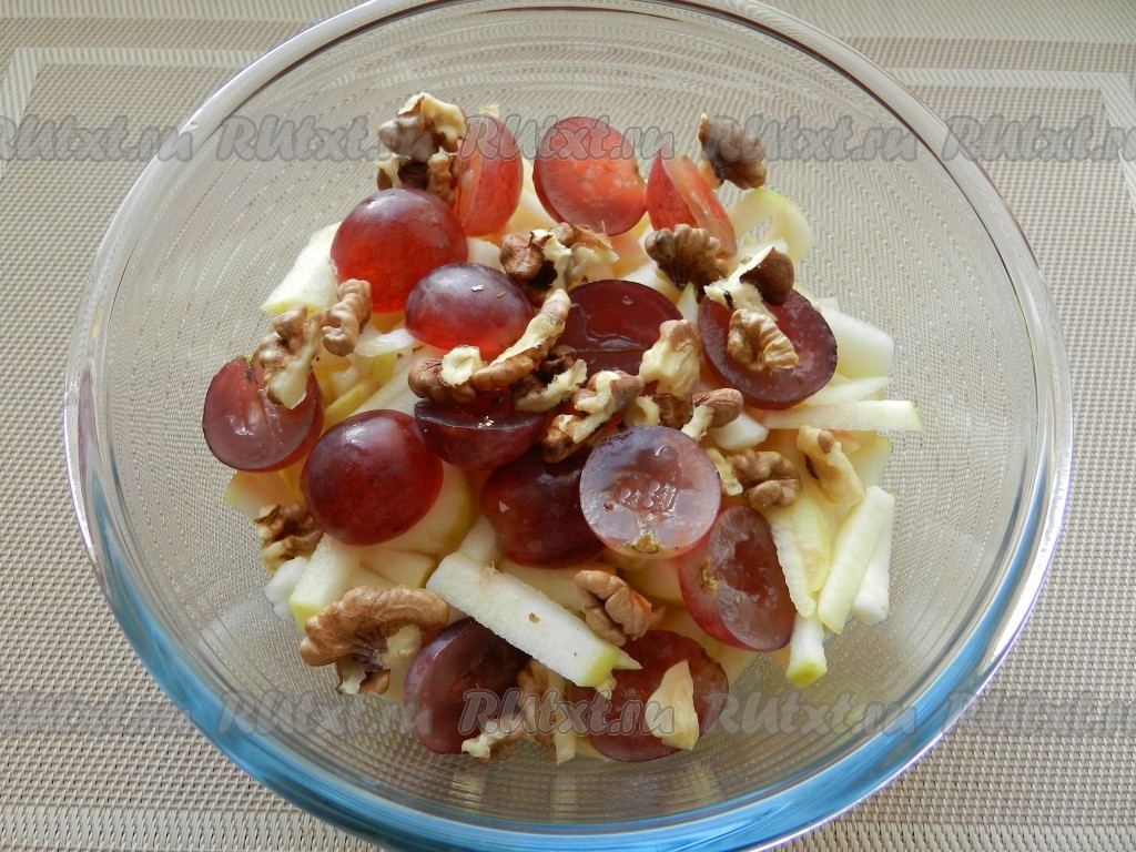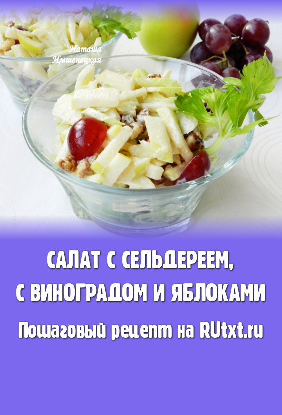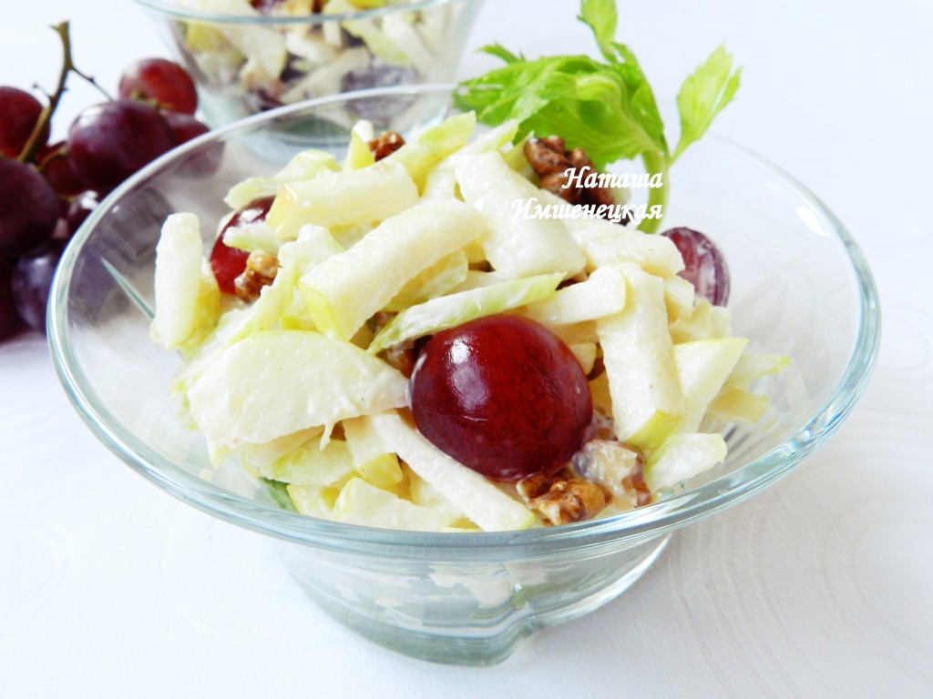 Салат, приготовленный с сельдереем, виноградом и яблоками по этому рецепту, называется "Вальдорф", относится он к американской кухне. Яблоки для этого блюда лучше брать кисло-сладкие. Салат получается очень вкусным, сочным, полезным, особенно он понравится любителям сельдерея.