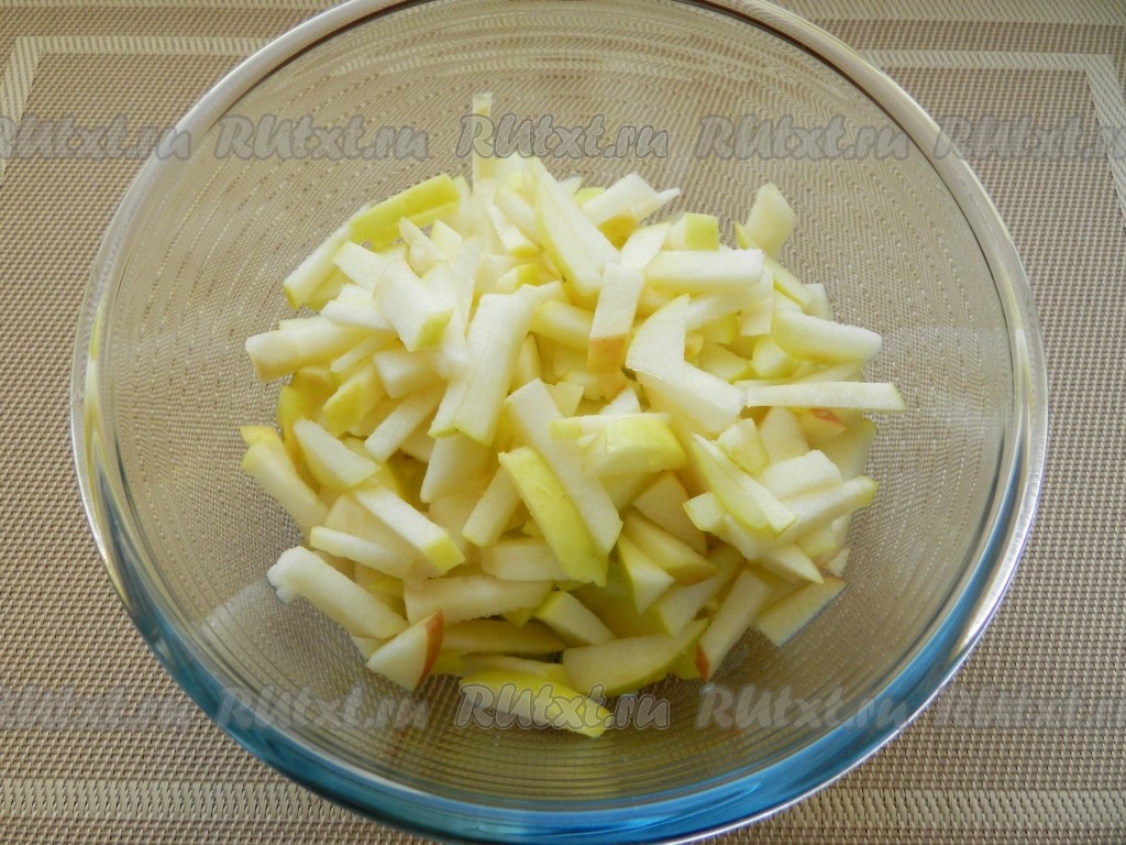 Из яблок удалить сердцевину, нарезать яблоки соломкой, сбрызнуть немного лимонным соком, чтобы яблоки не потемнели, выложить к сельдерею.