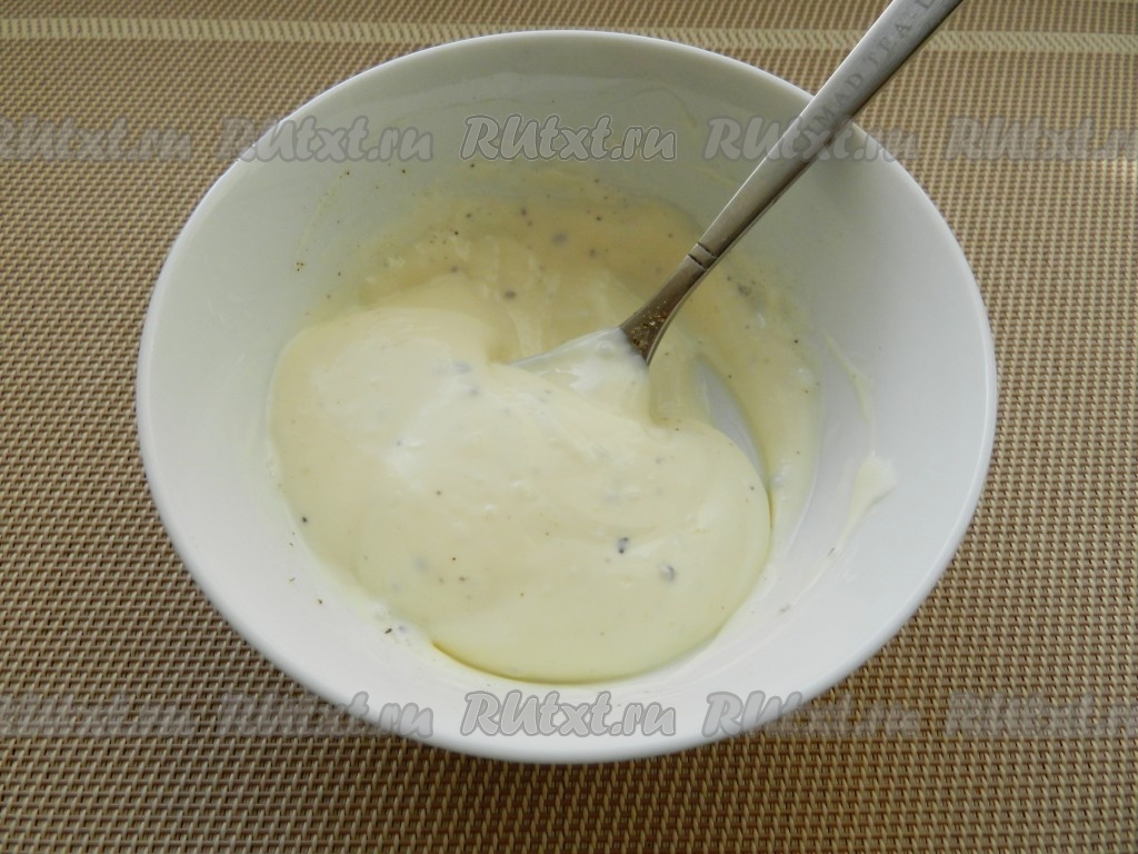 Для приготовления заправки смешать майонез с оставшимся лимонным соком и чёрным молотым перцем.