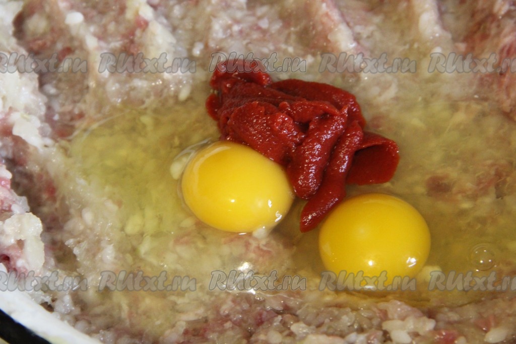 Добавить к фаршу яйца, специи и томатную пасту для цвета. Все хорошенько вымешать.