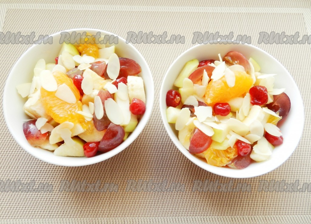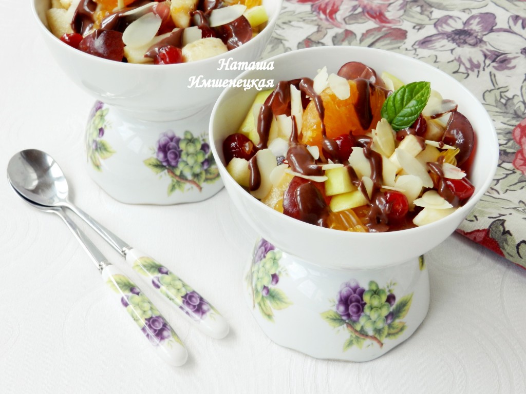 Подавать сладкий фруктовый салат лучше всего порционно. Разложить салат по креманкам, посыпать миндалем и полить шоколадным соусом.