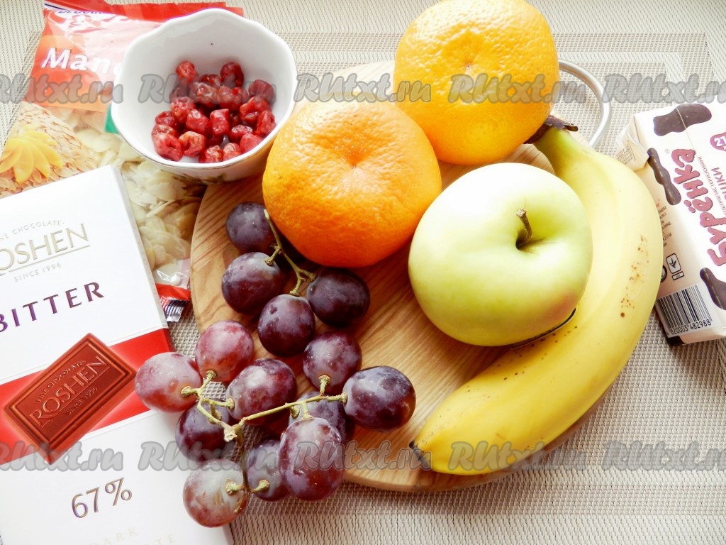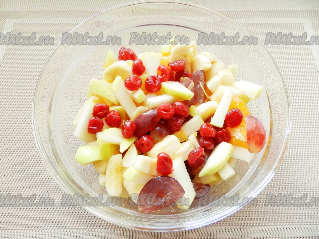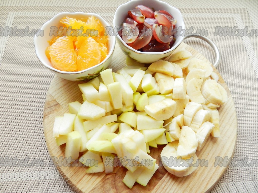 Мандарины очистить, разделить на дольки и очистить от пленочек. Виноградины разрезать на четвертинки, удалить косточки. Яблоко очистить от кожуры, нарезать небольшими кусочками, удалив сердцевину. Очистить и нарезать банан.
