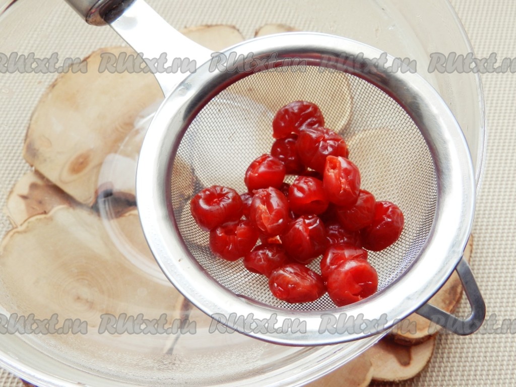 Вяленую вишню промыть, залить кипятком, оставить на 5 минут. Затем воду слить, ягоды обсушить.