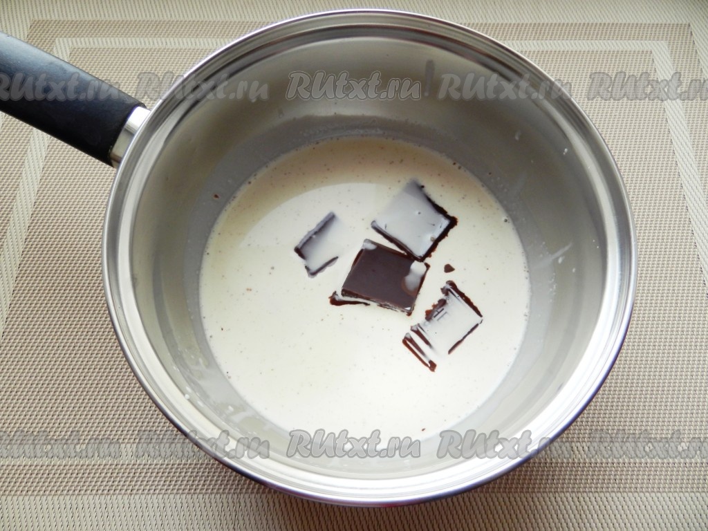 Сливки нагреть с ванильным сахаром, добавить разломанный на кусочки шоколад.
