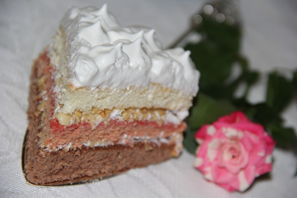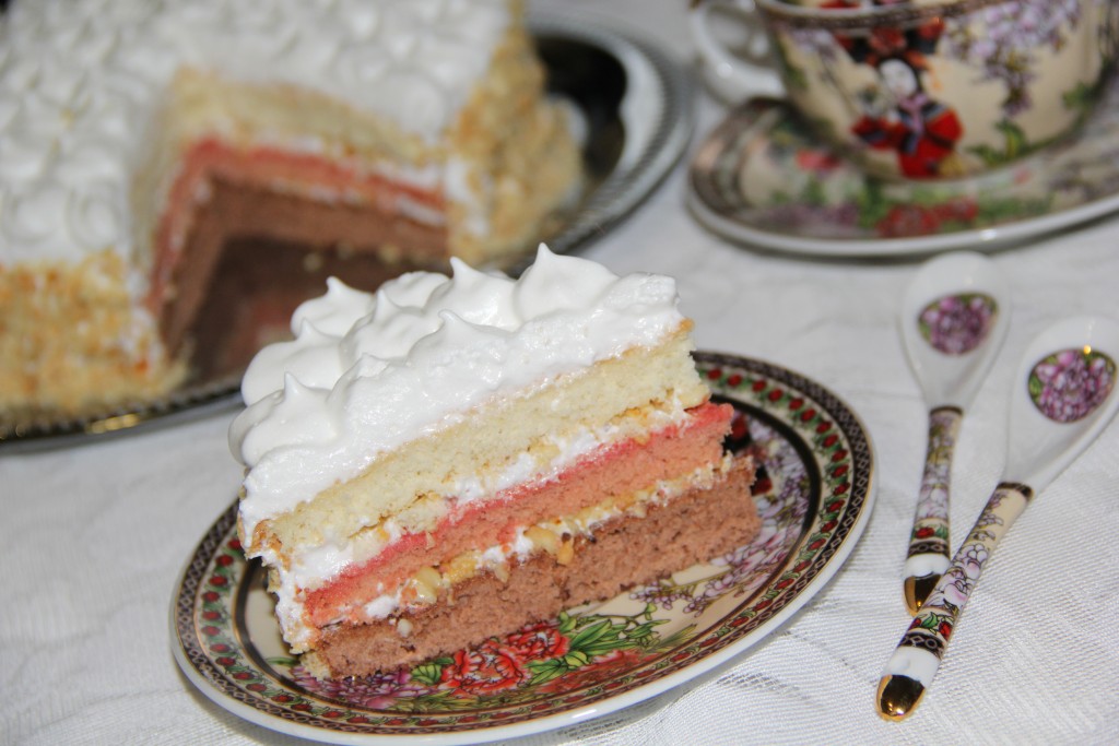 Однажды в Интернете я случайно нашла рецепт торта под названием "Юлия". Ассоциация с этим именем у меня очень хорошая, так как в моей жизни есть прекрасный человек - лучшая подруга с именем Юлия. Поэтому решила приготовить этот бисквитный торт с белковым кремом и ореховой посыпкой. Бисквиты выпекаются трёх разных цветов, от этого разрез тортика смотрится очень красиво и празднично. Мне и моим близким так понравился этот торт, что в нашей семье он стал одним из любимых.