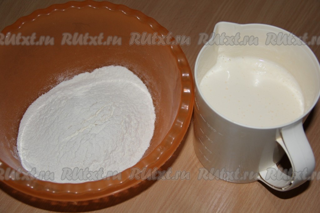 В глубокую миску просеять муку, затем влить белково-желтковую смесь, лопаткой движениями сверху вниз аккуратно перемешать и тесто для бисквита готово. Тесто получится воздушным, напоминающим сметану средней густоты.