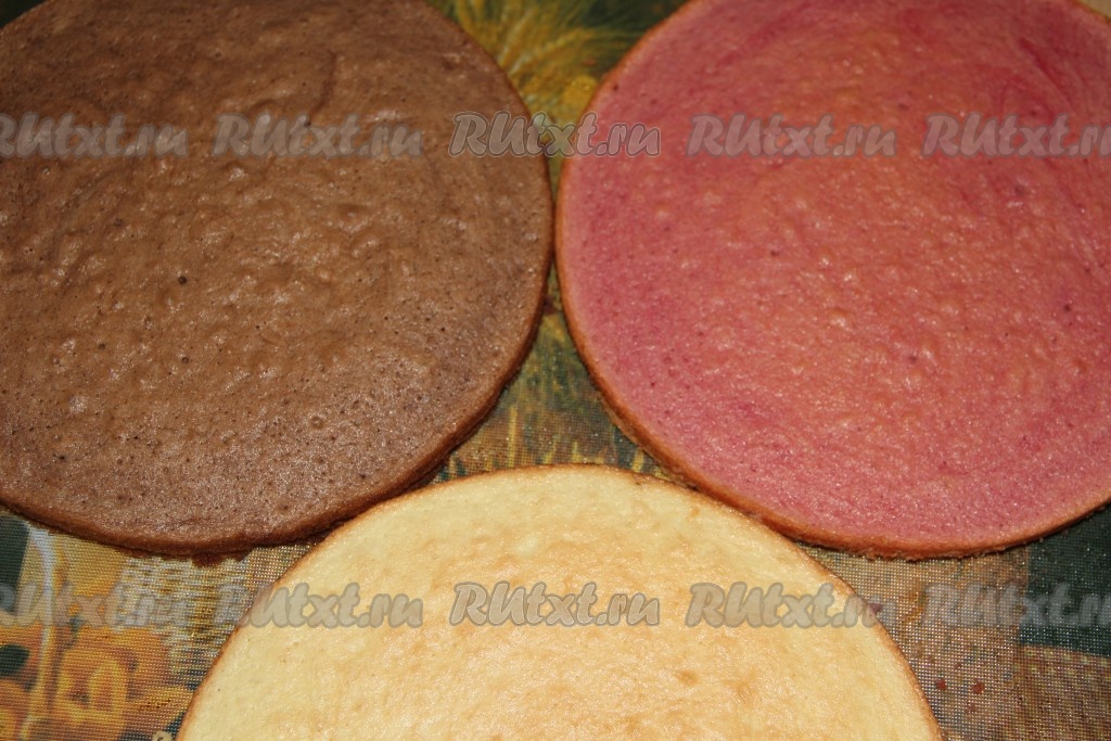 Разделить тесто для бисквита на три равные части. В одну часть добавить какао и хорошо перемешать. Во вторую часть добавить свекольный сок (или пищевой краситель красного цвета), а в третью часть - ванильный сахар. Форму для выпекания смазать растительным маслом. Я использовала разъёмную форму диаметром 26 см. Выложить в подготовленную форму тесто с какао и разровнять. Выпекать корж в разогретой духовке при температуре 180 градусов до готовности (готовность проверять сухой зубочисткой).