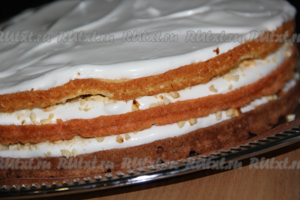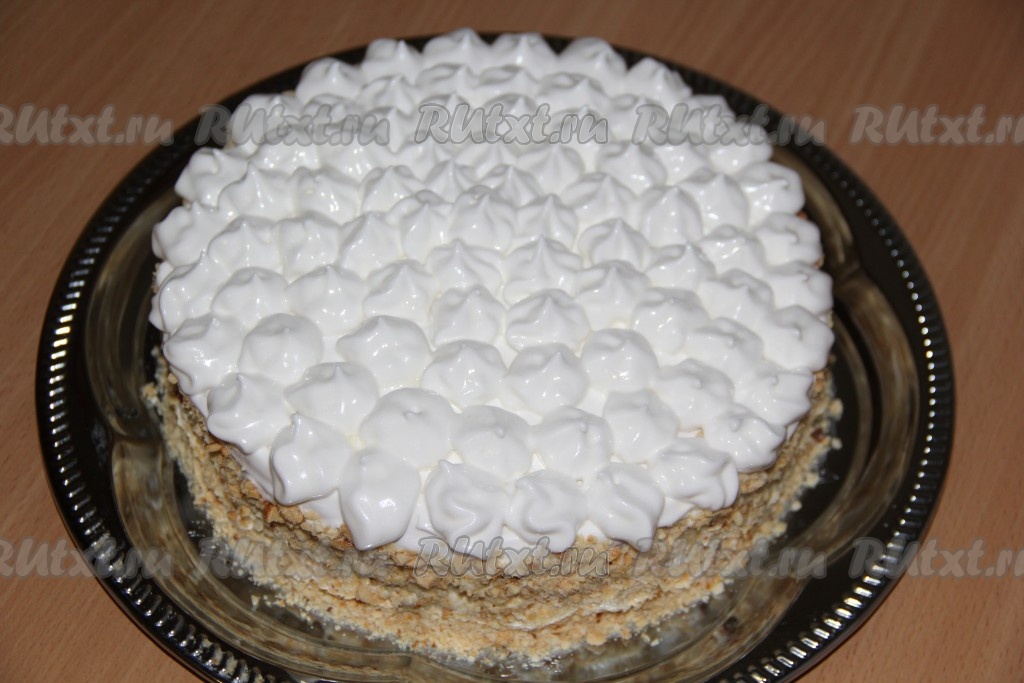Покрыть бока торта белковым кремом и обсыпать орехами. Оставшийся крем выложить в кондитерский мешок и украсить верх торта.