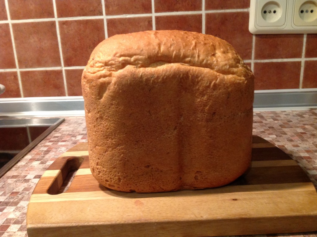 Вкусный пшеничный хлеб, приготовленный в хлебопечке, остужаем и подаём к столу.