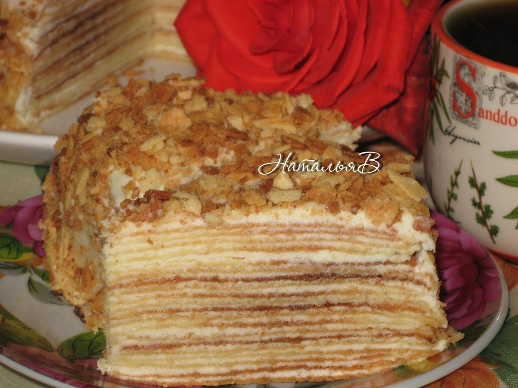 Затем начинаем выпечку вафельных коржей и сразу собираем торт, пока коржи горячие: испечь один корж в вафельнице, положить его на блюдо, смазать кремом, затем накрыть его вторым горячим коржом (прямо с вафельницы - не ждать ни минуты), аккуратно придавить, смазать кремом - так собрать весь торт "Наслаждение" (оставить 2-3 вафельки для обсыпки торта).