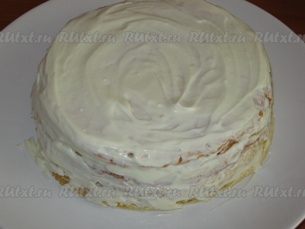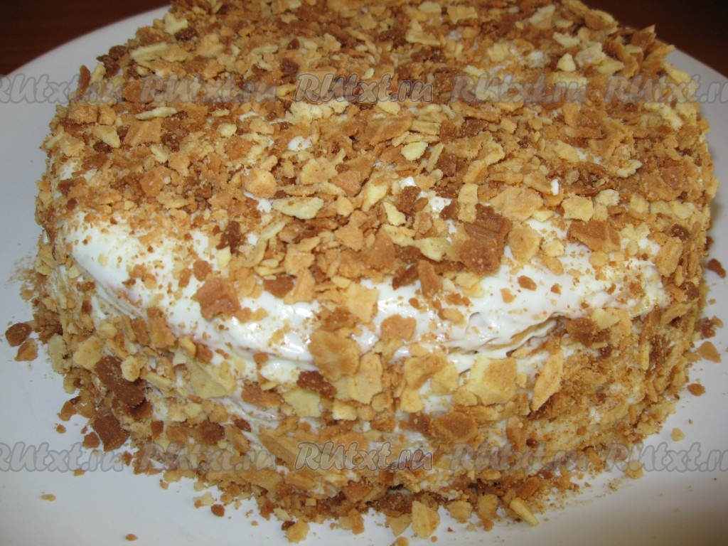Оставшиеся вафли раскрошить и обсыпать ими торт. Поставить наш тортик в холодильник на 1-2 часа.