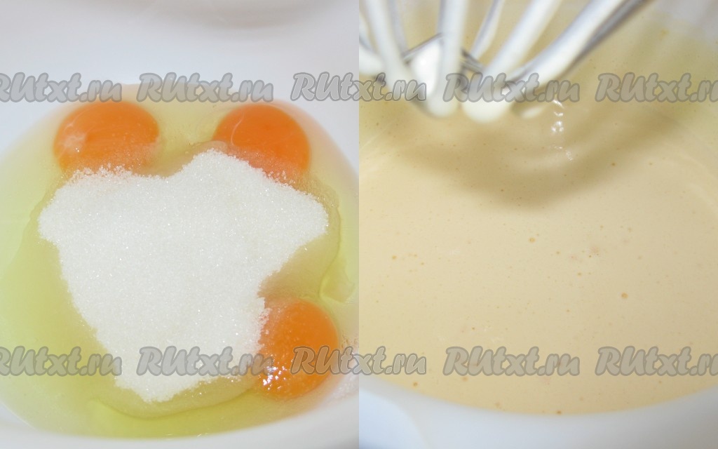 В чаше для взбивания соединить яйца и сахар, взбить до побеления.
