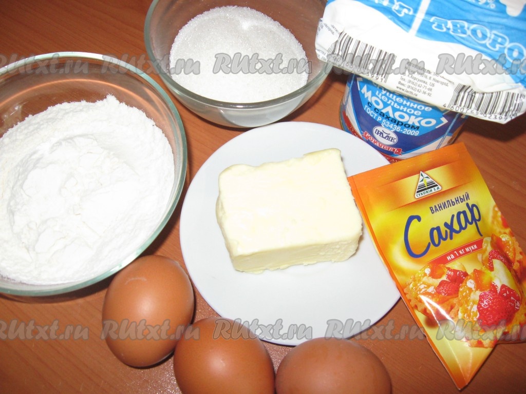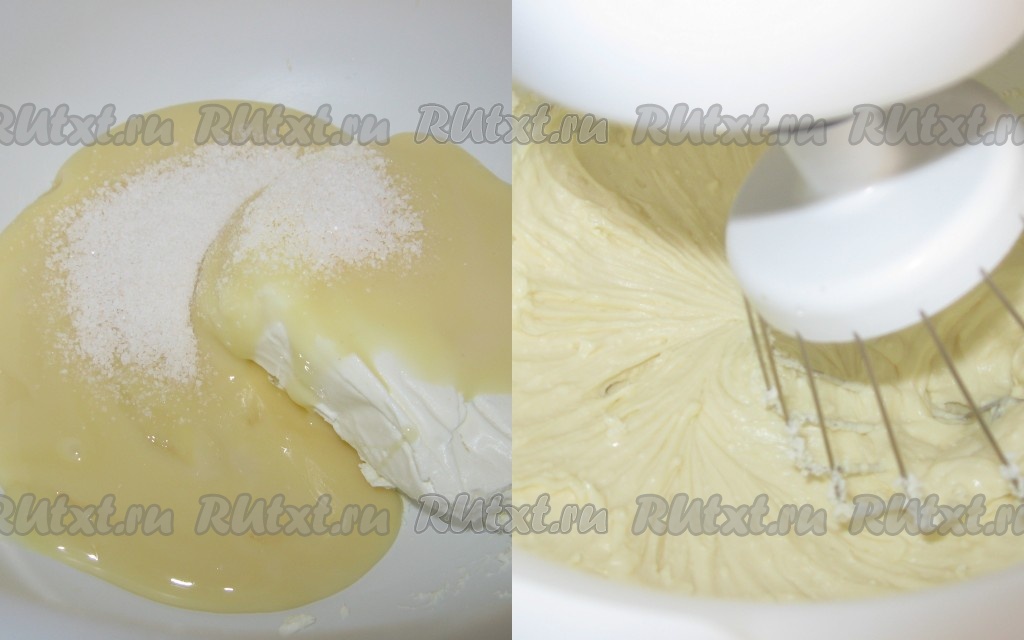 Для приготовления крема соединить творог, сгущенное молоко и ванильный сахар, взбить до однородной массы без комочков.