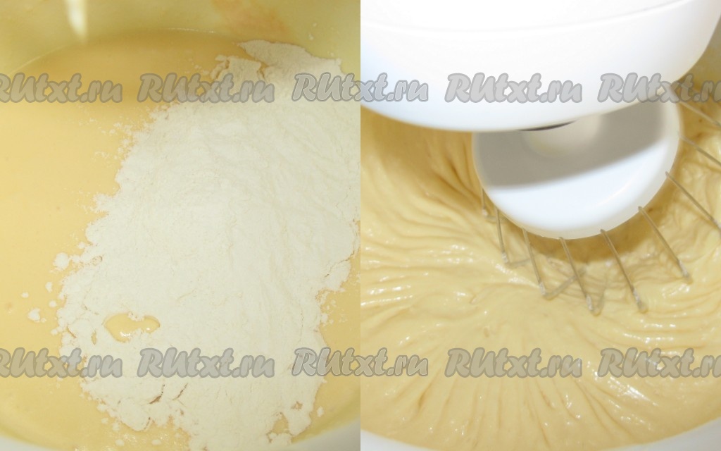 Далее частями всыпать просеянную муку и на небольшой скорости перемешать до однородной консистенции теста без комочков.